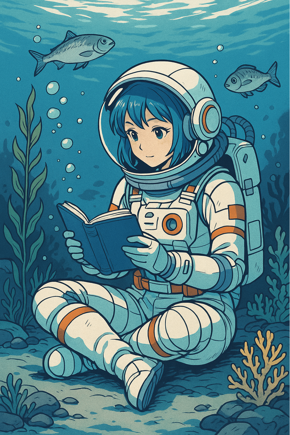 - “Una mujer astronauta leyendo un libro bajo el mar, en estilo de cómic japonés”.